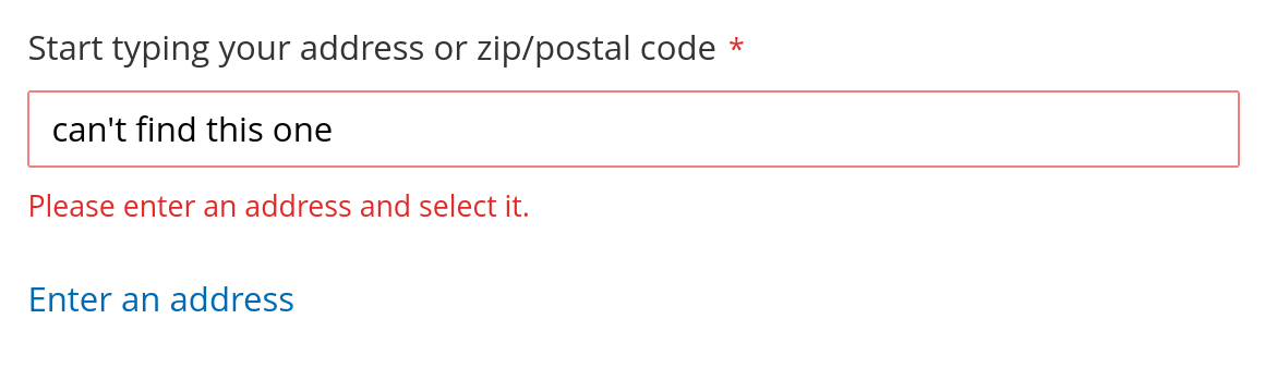 To allow users to skip the autocomplete field and manually enter an address, there's an option to add a link to manual address entry: