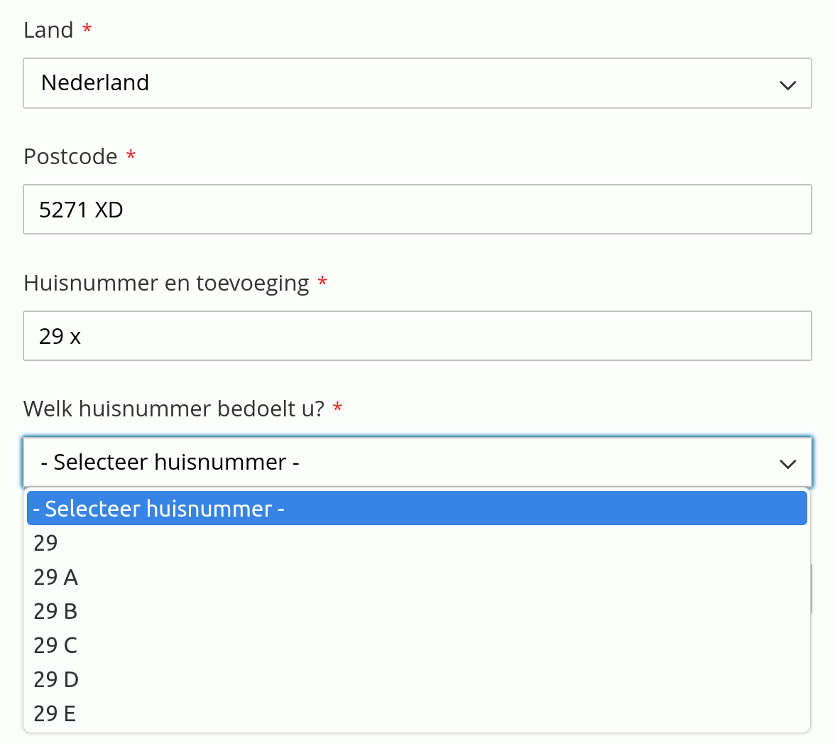 Get a Dutch address by postcode and house number. In this example asking the user to select from valid house number additions:
